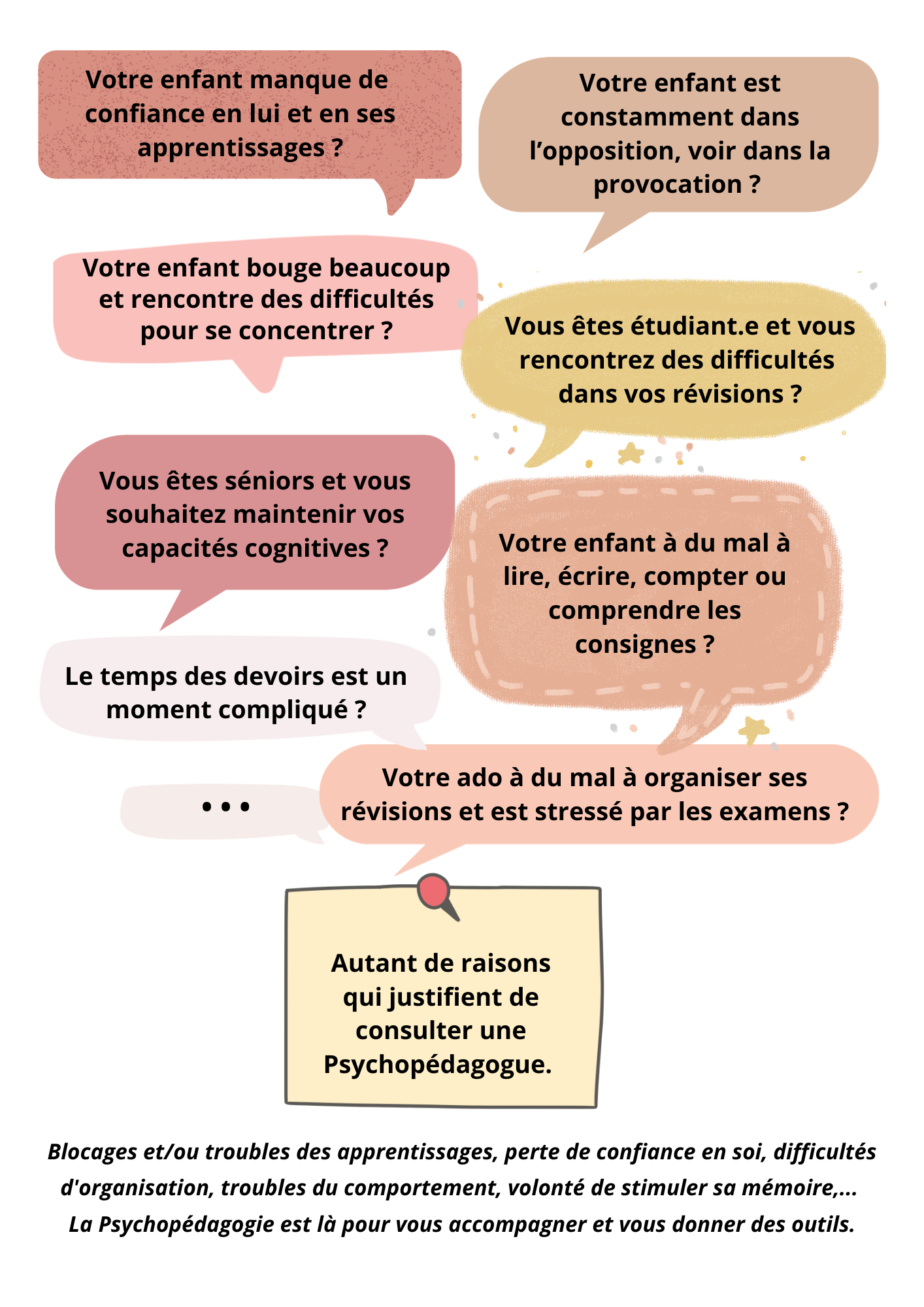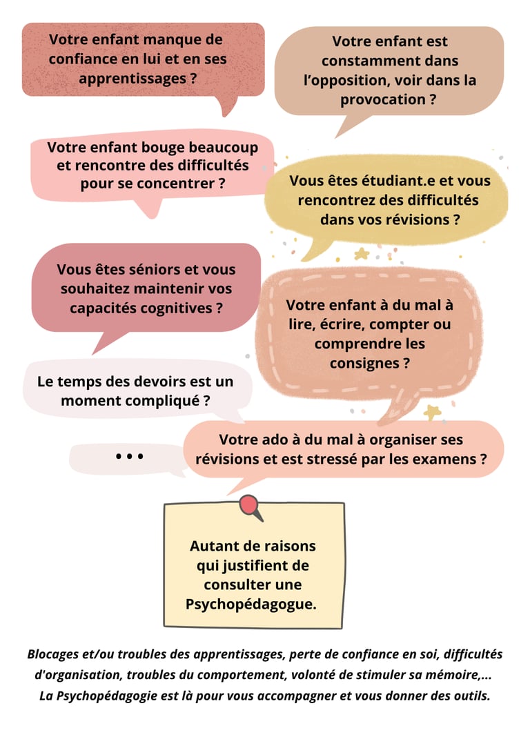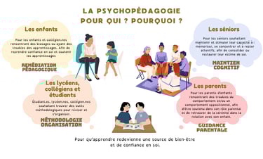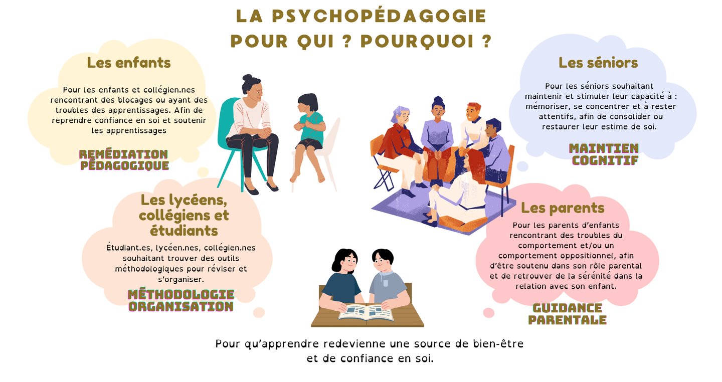 La Psychopédagogie consiste à accompagner les apprenants et apprenantes de tout âge, afin de lever les blocages limitants et de reprendre confiance en soi. Que ce soit dans le cadre de troubles des apprentissages, de difficultés d'organisation, de volonté de stimuler sa mémoire, ou d'être accompagné face aux défis de la parentalité, la psychopédagogie est là pour vous accompagner à travers une écoute bienveillante, des outils personnalisés.