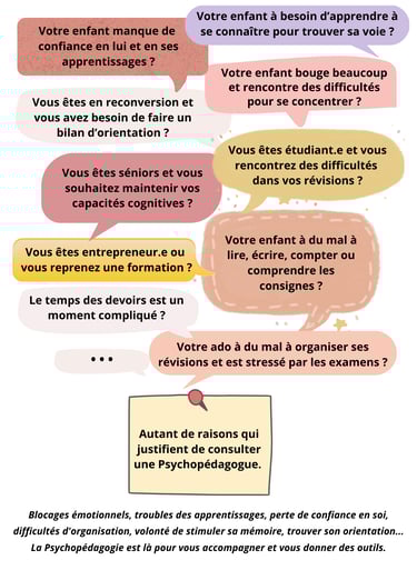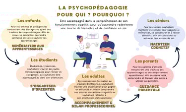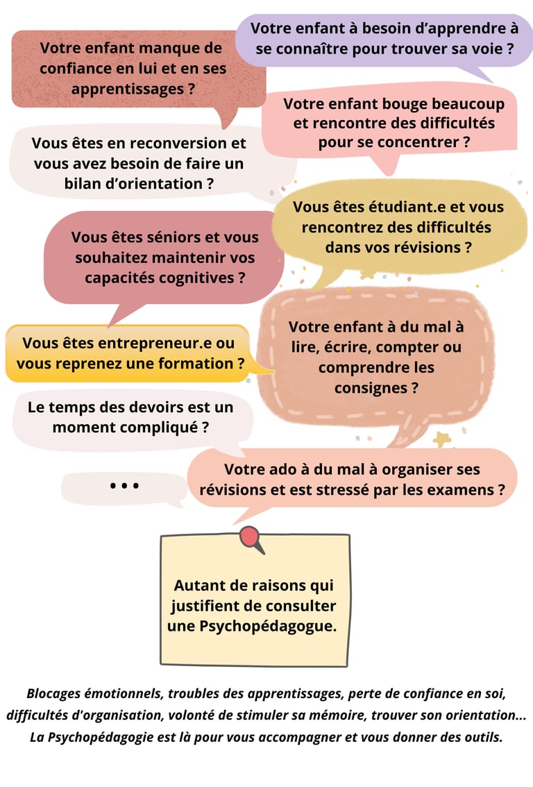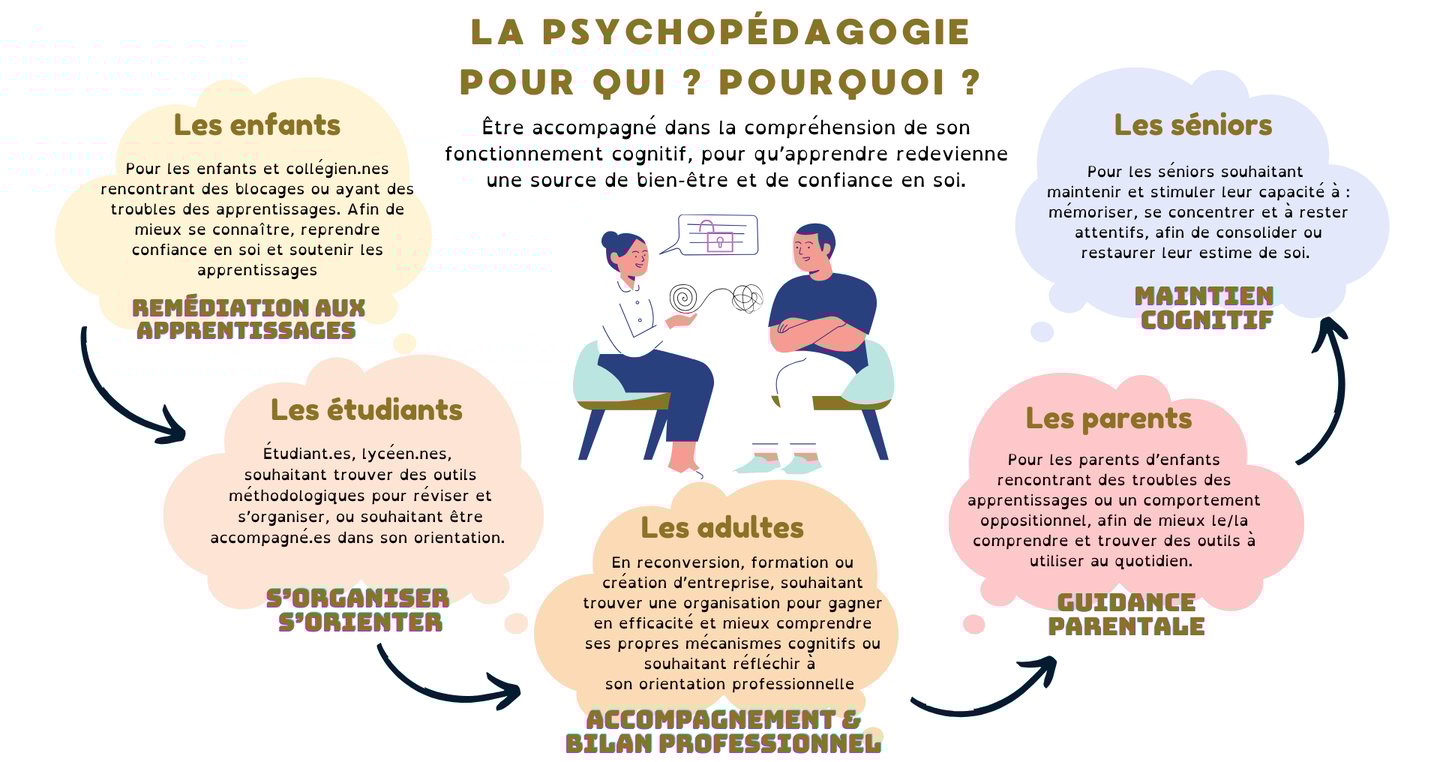 A la croisée des chemins entre la psychologie et la pédagogie, la Psychopédagogie consiste à accompagner les apprenants et apprenantes de tout âge (enfants, adolescents, adultes, séniors), afin de lever les blocages limitant et de mieux comprendre son fonctionnement cognitif. Que ce soit dans le cadre de troubles des apprentissages, de blocages émotionnels, de perte de confiance en soi, de difficultés d'organisation, de volonté de stimuler sa mémoire, ou de trouver son orientation, la psychopédagogie est là pour vous accompagner à travers une écoute bienveillante et des outils personnalisés.
